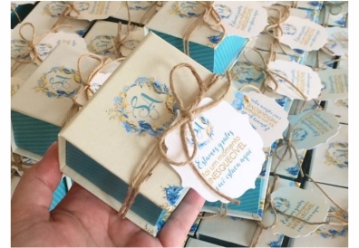 Na tampa interna você poderá colocar a mensagem que quiser, um convite ou um agradecimento, de acordo com seu objetivo, é só nos enviar sua mensagem!